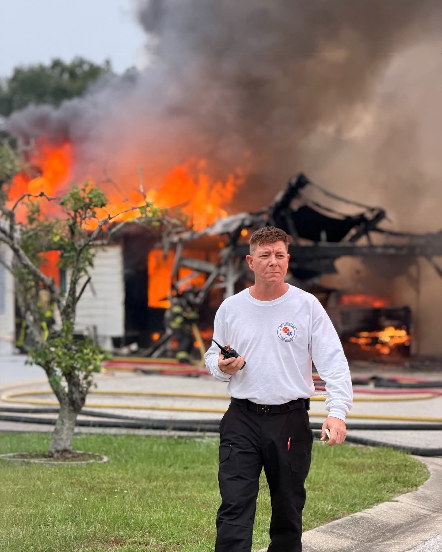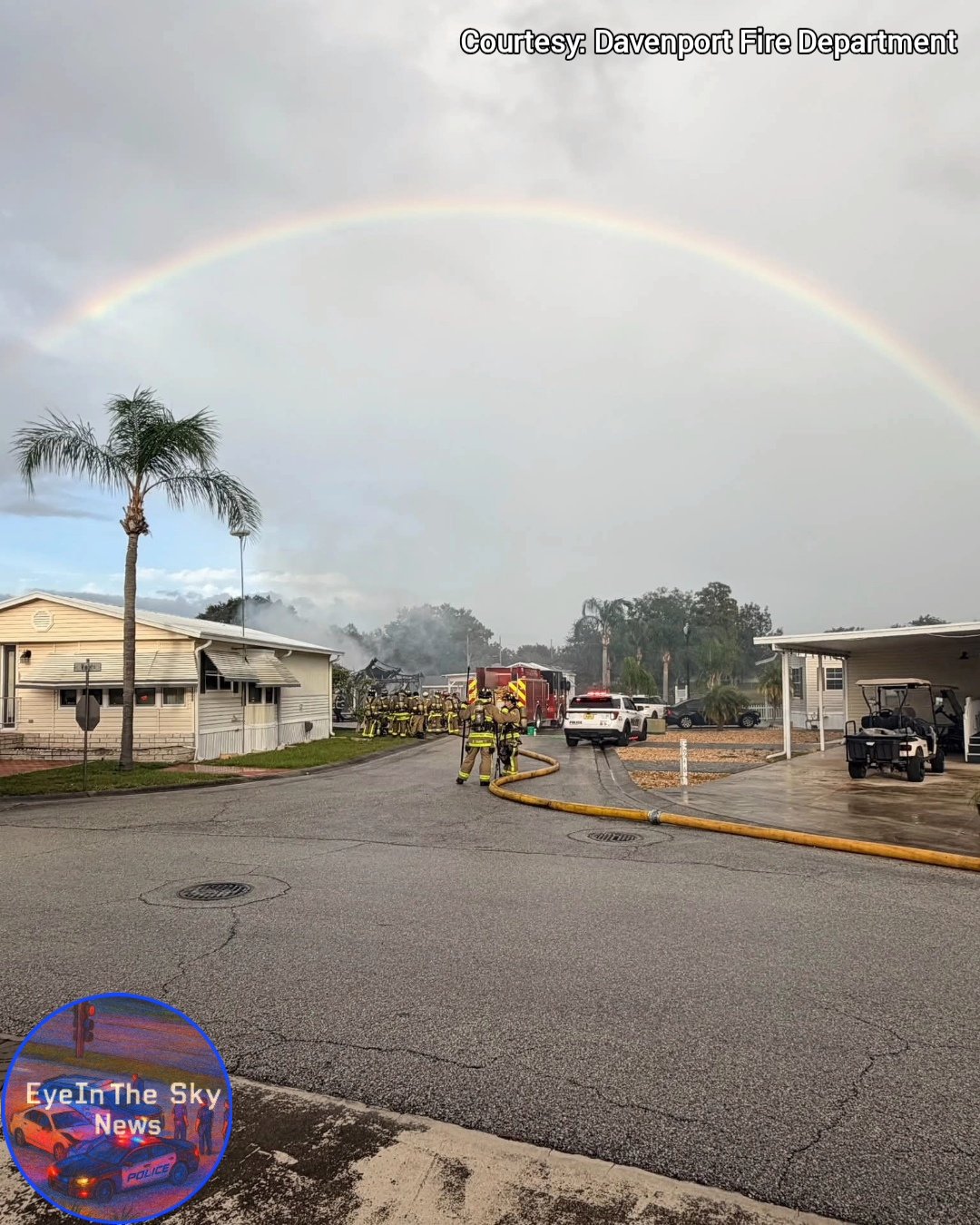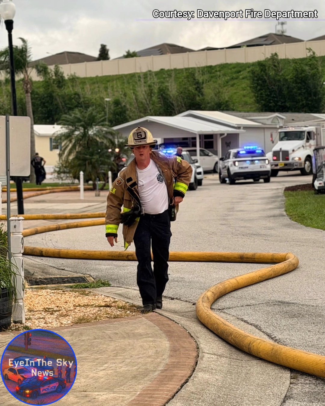 Davenport, FL — On Monday, September 29, at approximately 5:40 PM, Davenport Fire Rescue, Davenport Police Department, and Polk County Fire Rescue responded to a reported vehicle fire on the 100 block of Violet Court. Upon arrival, emergency crews discovered the fire had rapidly escalated, engulfing a nearby structure.