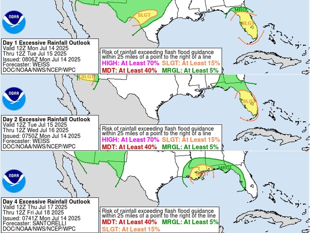 Regardless of whether the system develops, heavy rainfall is expected to produce localized flash flooding across portions of Florida and the north-central Gulf coast through Friday, July 18, 2025. Residents are advised to monitor updates at https://www.nhc.noaa.gov and local forecasts at https://www.weather.gov for detailed information.