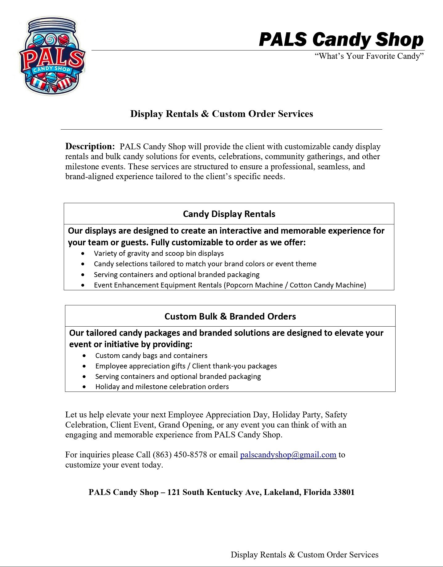 Downtown Lakeland’s beloved PALS Candy Shop, located at 121 S Kentucky Ave, Lakeland, FL 33801, has announced an exciting expansion of its services, launching Candy Display Rentals and Custom Bulk Candy Services to bring nostalgic sweetness to events across the region.