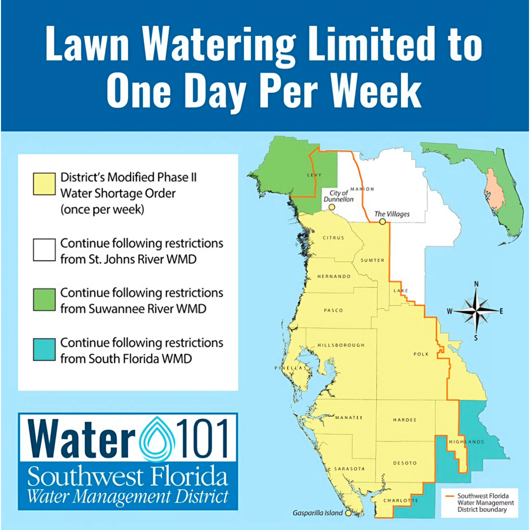 The Southwest Florida Water Management District Governing Board has declared a Modified Phase II “Severe” Water Shortage due to dry conditions across the region. The declaration requires residents, including those using private wells, to follow one-day-per-week lawn watering restrictions.