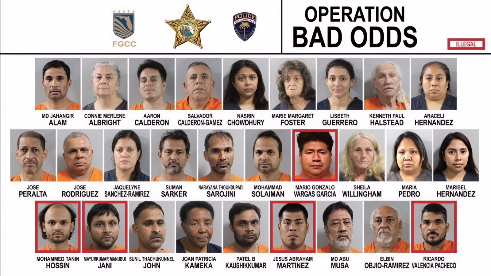 On September 3, 2025, the Polk County Sheriff’s Office, with assistance from the State of Florida Gaming Control Commission and Auburndale Police Department, executed “Operation Bad Odds,” targeting 10 stores in unincorporated areas and two in Auburndale. The investigation began with reports of concealed gambling machines in back rooms at A-1 Discount Beverage and Discount & Deli. Detectives confirmed the presence of these machines, leading to the identification of 11 stores, with a 12th discovered during the execution of search warrants. Authorities seized 48 gambling machines, two drink coolers, two firearms, and $100,971 in cash. Five of the arrested individuals were identified as being in the country illegally.