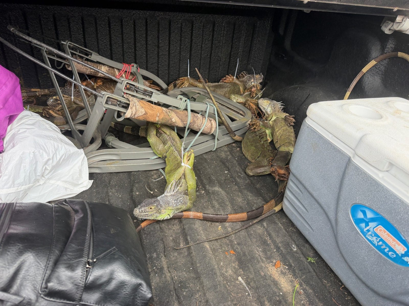 Due to inconsistencies in the driver’s travel explanation, troopers requested a K-9 unit from the Polk County Sheriff’s Office. The K-9 alerted to the vehicle and trailer. A subsequent search revealed five coolers containing iced tilapia and 13 live iguanas in the truck bed, with their feet zip-tied.